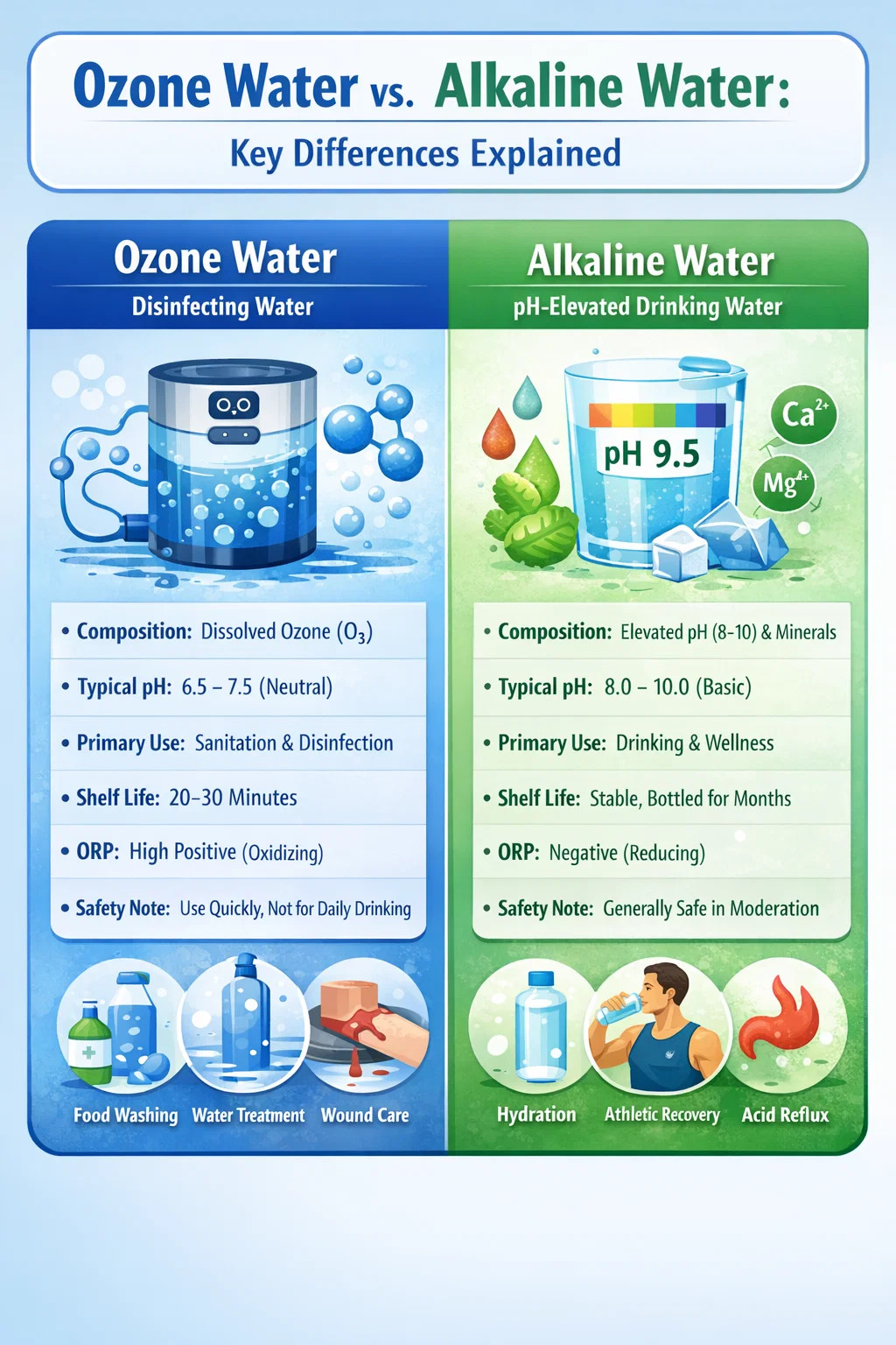 Ozonvand og alkalisk vand er forskellige produkter med forskellig kemi, forskellige anvendelser og forskellige evidensbaser. Ozonvand er et kraftfuldt, kortvarigt desinfektionsmiddel, der bedst bruges til sanitære opgaver - vask af mad, behandling af overflader og vandrensning. Alkalisk vand er et pH-forhøjet drikkevandsprodukt med beskedne og stadig omdiskuterede fordele relateret til hydrering og styring af sure opstød.