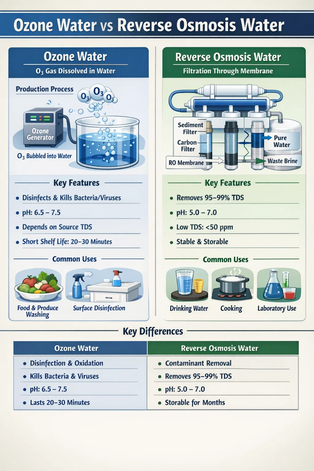 Ozonvand og omvendt osmosevand er ikke det samme, og de er ikke udskiftelige. Ozonvand er vand, der bruges som et aktivt desinfektionsmiddel; RO-vand er vand, hvorfra forureninger er blevet fysisk fjernet. Den første virker gennem kemi - oxidation og mikrobiel ødelæggelse. Den anden arbejder gennem fysik - trykfiltrering på molekylær skala.
